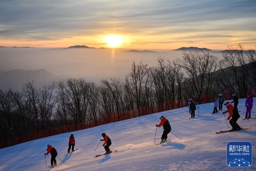 1月1日,在吉林省吉林市萬科松花湖度假區(qū),滑雪愛好者在晨光下滑雪。新華社記者 顏麟蘊(yùn) 攝