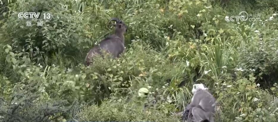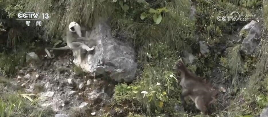 突然,林間騷動(dòng)起來,幾只長(zhǎng)尾葉猴從天而降來到塔爾羊中間,這是首次記錄到這兩個(gè)物種群體同框覓食的珍貴畫面。對(duì)它們而言,聚在一起可以加強(qiáng)警戒,更容易發(fā)現(xiàn)天敵。