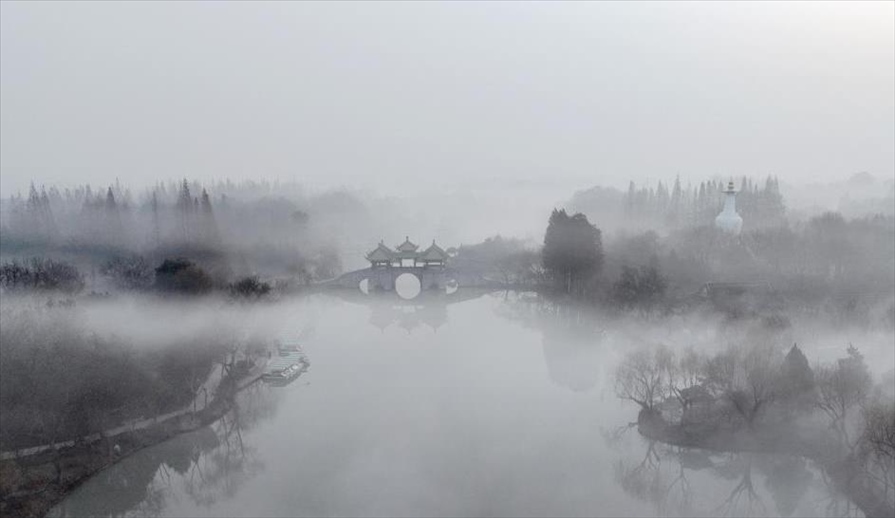 2024年1月6日,江蘇揚(yáng)州,瘦西湖風(fēng)景區(qū)在晨霧中若隱若現(xiàn),宛如一幅水墨畫卷,美不勝收。