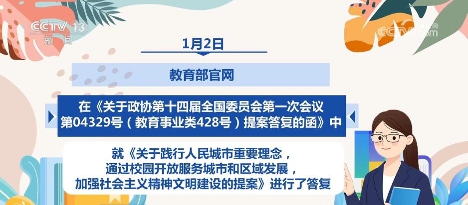 1月2日,教育部官網(wǎng)在《關(guān)于政協(xié)第十四屆全國委員會第一次會議第04329號(教育事業(yè)類428號)提案答復(fù)的函》中,就《關(guān)于踐行人民城市重要理念,通過校園開放服務(wù)城市和區(qū)域發(fā)展,加強社會主義精神文明建設(shè)的提案》進行了答復(fù)。
