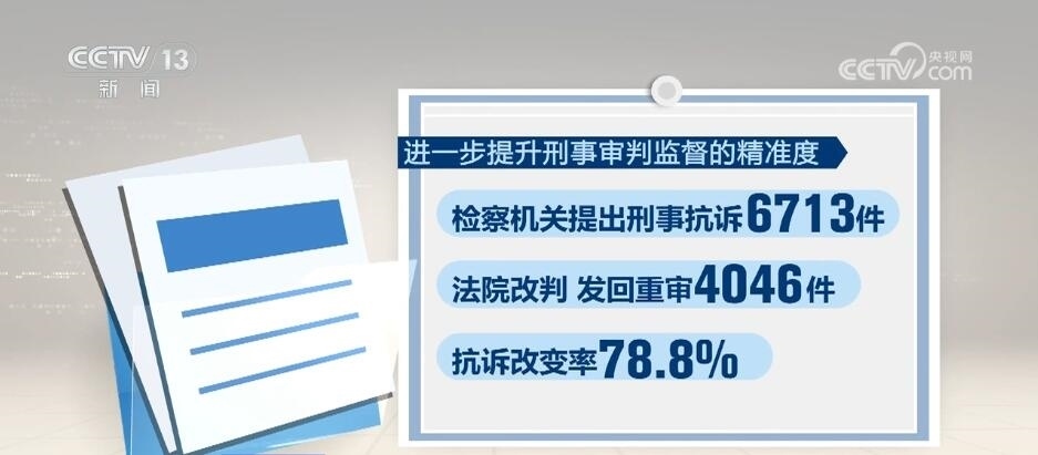 進(jìn)一步提升刑事審判監(jiān)督的精準(zhǔn)度,檢察機(jī)關(guān)提出刑事抗訴6713件,法院改判、發(fā)回重審4046件,抗訴改變率78.8%。同時,檢察機(jī)關(guān)深化“派駐+巡回”檢察工作,對不當(dāng)減刑、假釋、暫予監(jiān)外執(zhí)行共提出糾正意見1.8萬人。