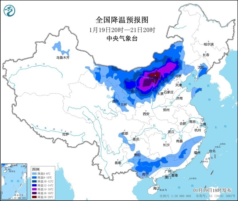 預(yù)計(jì),1月19日20時(shí)至1月21日20時(shí),西北地區(qū)東部、內(nèi)蒙古中西部、華北北部、華南等地的部分地區(qū)將降溫8~12℃,其中,內(nèi)蒙古河套地區(qū)和中部、陜西北部、山西北部、河北西北部等地部分地區(qū)降溫可達(dá)14~16℃,局地可超過18℃。
