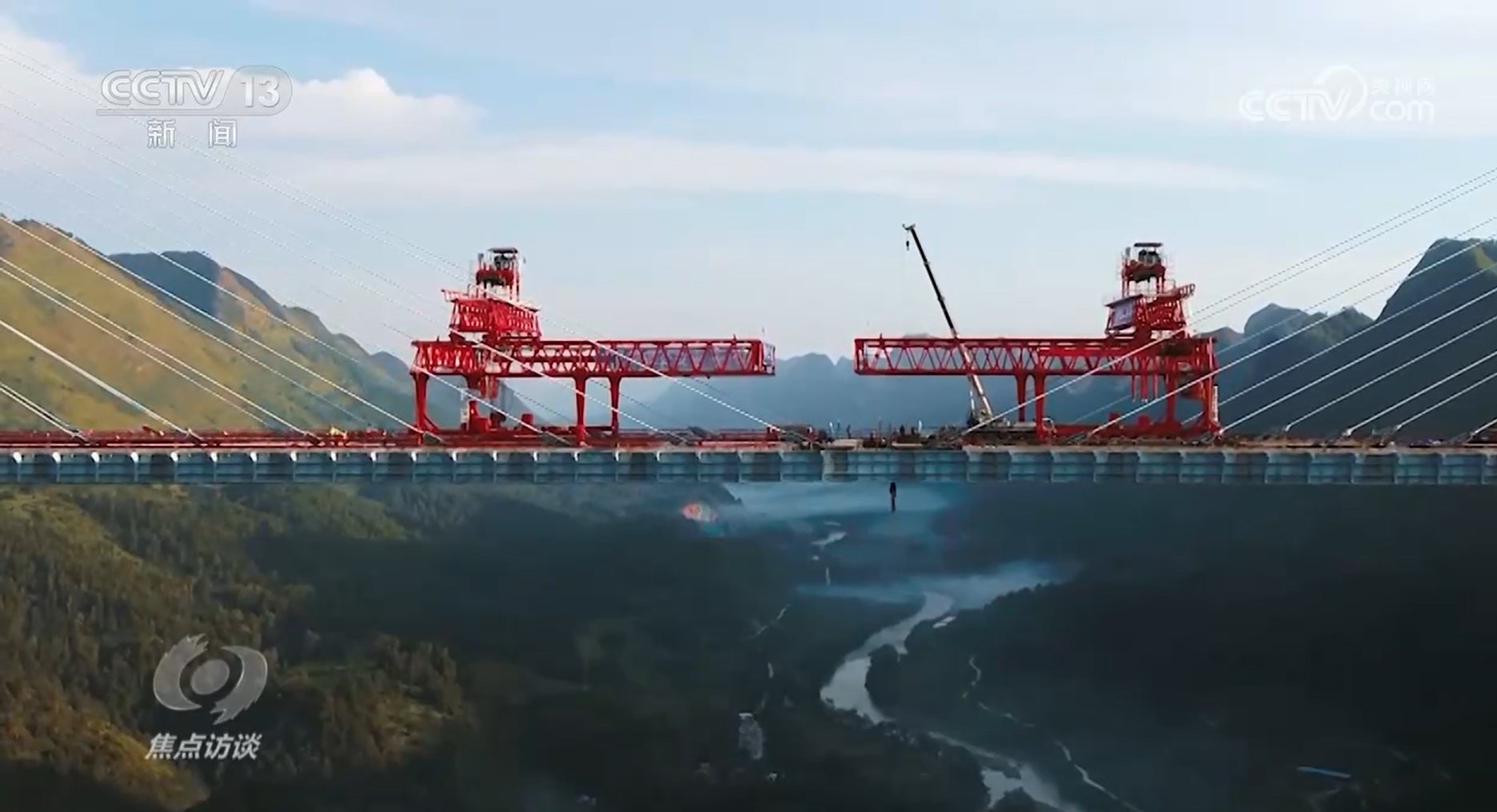 杭瑞高速貴州段,北盤江第一橋,擁有565米的高度和720米的主跨。建造時,主跨被拆分成60個160噸重的節(jié)段,需要在近600米高空進行拼接、合龍。