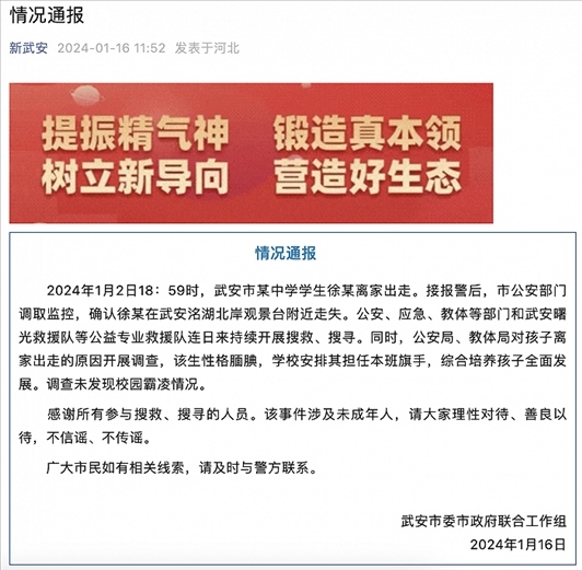 ·河北武安通報“一高中生失聯(lián)十余日”:未發(fā)現(xiàn)校園霸凌情況。