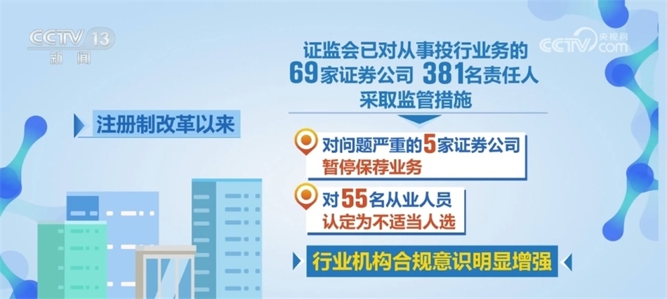數(shù)據(jù)顯示,注冊制改革以來,證監(jiān)會(huì)已對從事投行業(yè)務(wù)的69家證券公司、381名責(zé)任人采取了監(jiān)管措施,特別是對問題嚴(yán)重的5家證券公司暫停保薦業(yè)務(wù),對55名從業(yè)人員認(rèn)定為不適當(dāng)人選,行業(yè)機(jī)構(gòu)合規(guī)意識明顯增強(qiáng)。