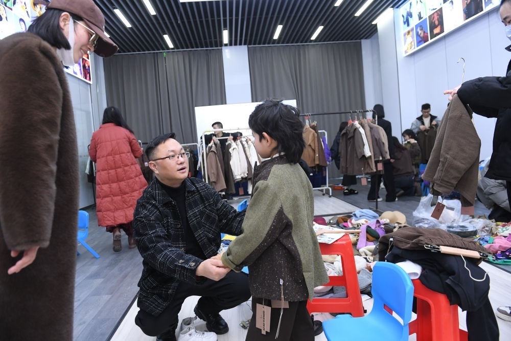 2024年1月17日,在位于浙江省湖州市織里鎮(zhèn)的萬順服飾股份有限公司,工作人員(前左二)在品牌的2024秋季新品審版會后臺和小模特交流??椑镦?zhèn)是中國最大的童裝產業(yè)集群地,聚集著1.4萬家童裝企業(yè)。新華社記者 翁忻旸 攝