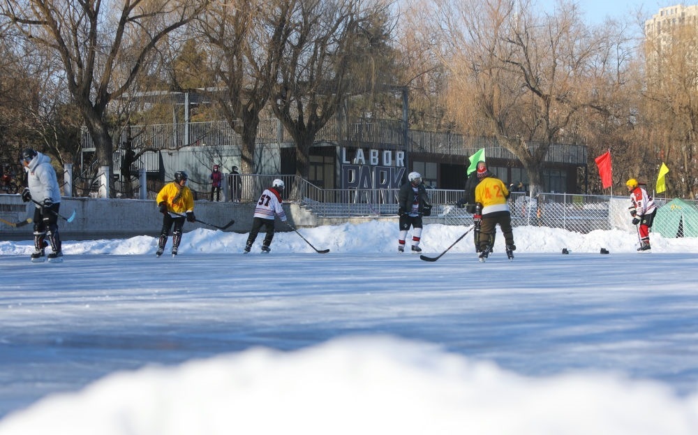 ?2024年1月7日,冰球愛(ài)好者在遼寧省沈陽(yáng)市勞動(dòng)公園人工湖上打冰球。新華社記者 陳為 攝