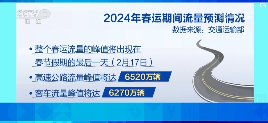交通運(yùn)輸部預(yù)計(jì),2024年春運(yùn)期間,全國(guó)公路網(wǎng)日均流量將達(dá)3720萬(wàn)輛,比2023年同期增長(zhǎng)7.5%。整個(gè)春運(yùn)流量的峰值將出現(xiàn)在春節(jié)假期的最后一天,也就是2月17日,高速公路流量峰值將達(dá)6520萬(wàn)輛,客車流量峰值將達(dá)6270萬(wàn)輛。