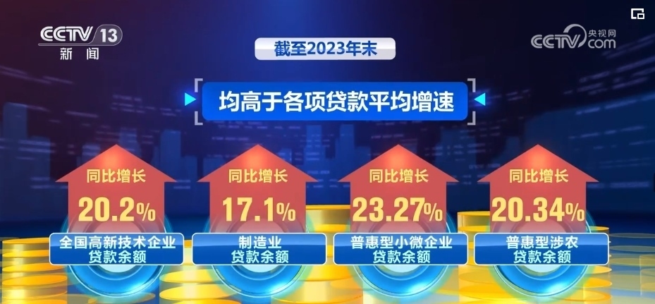 截至2023年末,全國高新技術(shù)企業(yè)貸款余額同比增長20.2%,制造業(yè)貸款余額同比增長17.1%,普惠型小微企業(yè)貸款余額同比增長23.27%,普惠型涉農(nóng)貸款余額同比增長20.34%,均高于各項貸款平均增速。