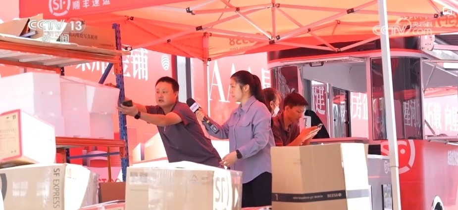 記者在現(xiàn)場發(fā)現(xiàn),一些毛絨玩具等商品被零散地放在快遞點,并沒有及時被打包。快遞員說他從早上7時30分就提前過來,但包材很快就用完了,這是他沒想到的。
