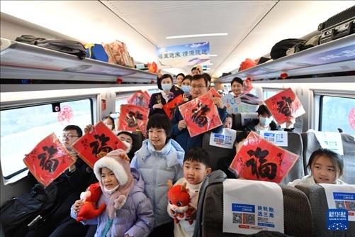 1月26日,在由南京南站發(fā)往太倉的G8981次列車上,南京客運段的工作人員與收到“?!弊值穆每秃嫌?。新華社記者 柳文惠 攝