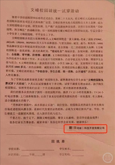 ·無工商登記的科技公司在河南安陽推廣校園鞋,159元一雙,教育局:“是有校園鞋試穿活動,對公司情況不清楚?!鄙媸鹿荆汗久謱戝e了。