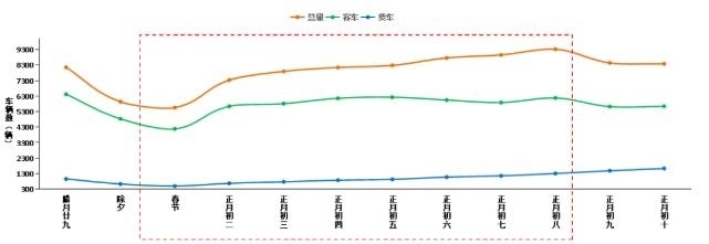 預計春節(jié)期間(含除夕),普通公路日均斷面交通量約7800輛,同比2023年增長約8.2%,如圖4所示。相較于高速公路,普通公路在春節(jié)期間流量較為平穩(wěn),沒有顯著高峰,在節(jié)前明顯下降,除夕達到最低值,初三以后交通量有所回升。