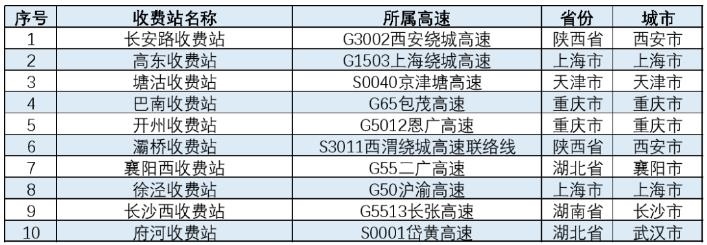 春節(jié)期間,全國高速公路預計易發(fā)生擁堵緩行的收費站,如下表所示。