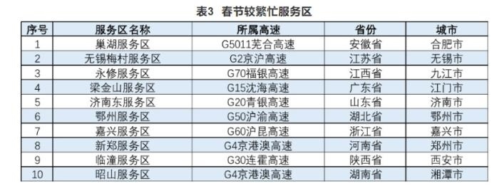 報告還公布了高速公路預計易發(fā)生擁堵緩行的路段、收費站以及較繁忙的服務區(qū)。