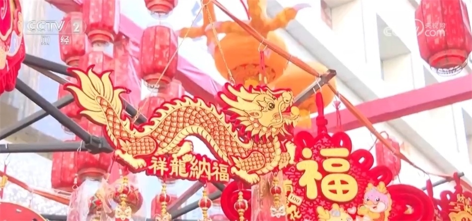 年集現(xiàn)場,不少商家還將帶有龍元素的新年小物件擺放在醒目位置,包括福字貼、紅燈籠、龍玩偶、新年擺件等,無數(shù)個紅彤彤的小掛件營造出濃厚的新年氛圍,吸引不少市民購買。