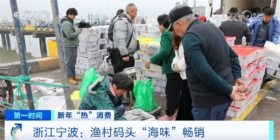 浙江寧波奉化區(qū)莼湖街道的漁村碼頭也進(jìn)入了年前最后的繁忙時刻。上午八點,5艘運(yùn)輸船??吭趦?nèi)外碼頭上,據(jù)了解,一艘運(yùn)輸船有七八千箱漁獲物,近八成是帶魚。最近每天有百萬斤東海魚貨就地銷售或運(yùn)往全國各地,預(yù)計將持續(xù)至臘月二十七。在碼頭邊桐照魚市場的攤位上,色澤鮮亮的帶魚、鯧魚、大黃魚等海產(chǎn)品琳瑯滿目,市民們忙著挑選,漁商們則賣力吆喝著。