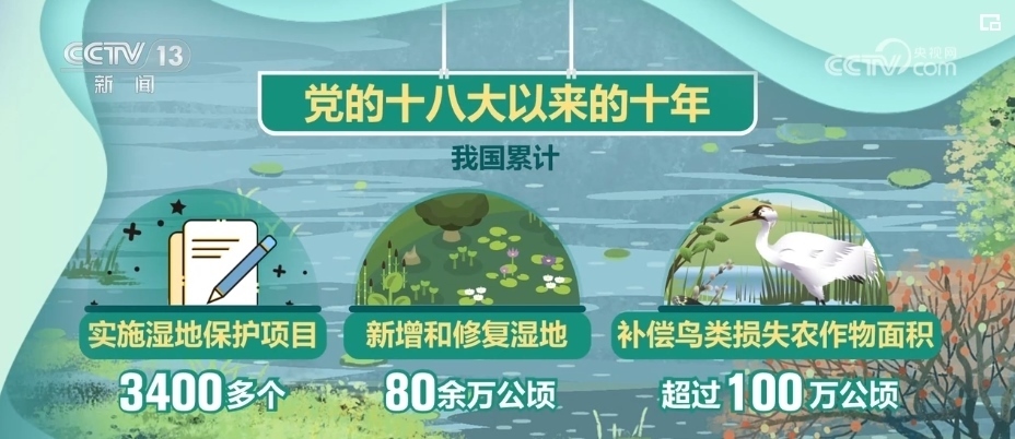 黨的十八大以來的十年,我國累計(jì)實(shí)施濕地保護(hù)項(xiàng)目3400多個(gè),新增和修復(fù)濕地80余萬公頃,補(bǔ)償鳥類損失農(nóng)作物面積超過100萬公頃。
