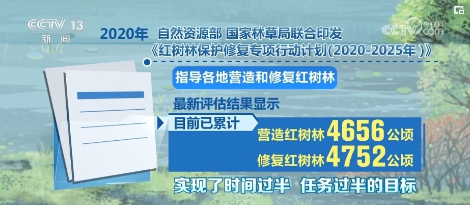 2020年,自然資源部、國家林草局聯(lián)合印發(fā)《紅樹林保護(hù)修復(fù)專項(xiàng)行動(dòng)計(jì)劃(2020—2025年)》,指導(dǎo)各地營造和修復(fù)紅樹林。最新評(píng)估結(jié)果顯示,目前,已累計(jì)營造紅樹林4656公頃,修復(fù)紅樹林4752公頃,實(shí)現(xiàn)了時(shí)間過半、任務(wù)過半的目標(biāo)。