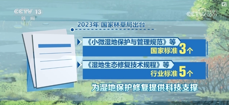 2023年,國家林草局出臺(tái)《小微濕地保護(hù)與管理規(guī)范》等國家標(biāo)準(zhǔn)3個(gè)、《濕地生態(tài)修復(fù)技術(shù)規(guī)程》等行業(yè)標(biāo)準(zhǔn)5個(gè),為濕地保護(hù)修復(fù)提供科技支撐。