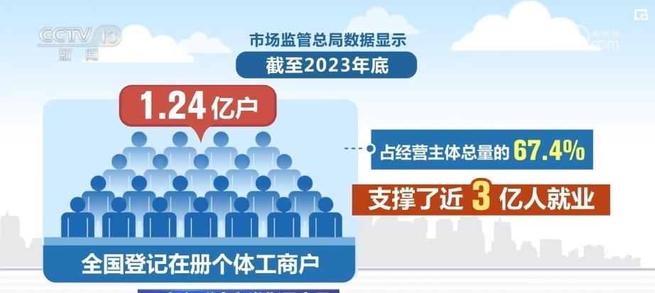 市場(chǎng)監(jiān)管總局?jǐn)?shù)據(jù)顯示,截至2023年底,全國(guó)登記在冊(cè)個(gè)體工商戶1.24億戶,占經(jīng)營(yíng)主體總量的67.4%,支撐了近3億人就業(yè)。