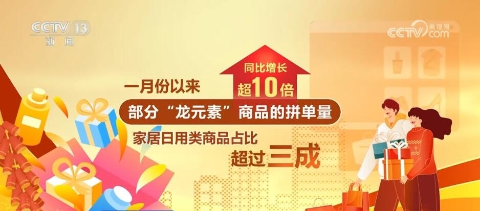 “龍元素”當(dāng)仁不讓地成為今年春節(jié)的新“頂流”,不光有龍年的福字對聯(lián),還有龍年臺歷、龍寶寶毛絨玩具、龍年紅色內(nèi)衣、龍年中國結(jié)掛飾成為最熱銷的春節(jié)周邊商品前五名。1月份以來,部分“龍元素”商品的拼單量同比增長超10倍,其中,家居日用類商品占比超過三成。