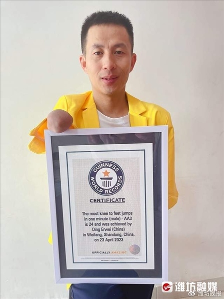 山東濰坊,42歲的丁二偉在8歲時,因為調(diào)皮摸了村里的變壓器造成雙臂截肢。他當了11年殘疾人長跑運動員,退役已經(jīng)有10年了。2日,他收到吉尼斯總部寄來的證書,挑戰(zhàn)的項目是一分鐘跪跳起,他一分鐘跳了24個,是跪跳起跳得最多的人。