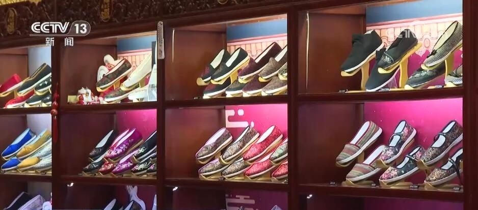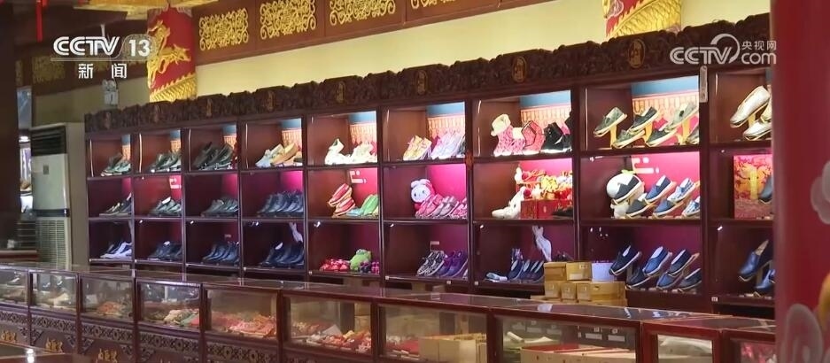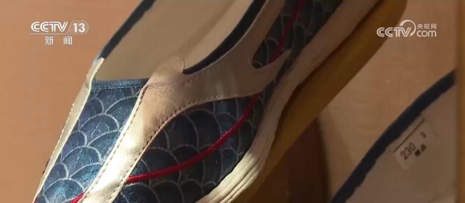 北京內聯(lián)升鞋業(yè)有限公司總經理 程旭:這款鞋是與《山海經》聯(lián)名,它每一片龍的龍鱗是可以打開。這款鞋我們去年和故宮聯(lián)名推出的一款漢服鞋,你看這個叫龍角鞋,還有龍的觸角,有龍鱗,還有龍的須子,搭配這種漢服非常別致、非常時尚。
