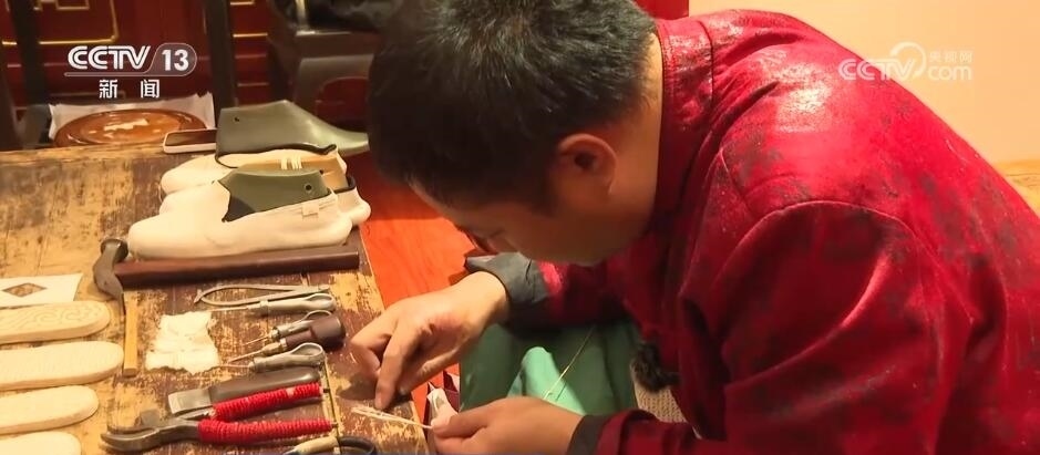 內聯(lián)升千層底布鞋制作技藝第五代傳承人 徐文浩:手工納的底用的是一種麻繩,像機器納底用的就是棉線。這個麻繩我們也是手工搓出來的,機器走不了這種不規(guī)矩的線。這個麻繩在鞋底里整個會膨脹,會把所有的布鎖在一起,咱們穿的時候,說第一層鞋底磨破了,麻繩都磨斷了,它不會散,它只會越磨越薄。像這種機器納的,這個線如果說磨斷了,這個底一層一層就開始脫落了。