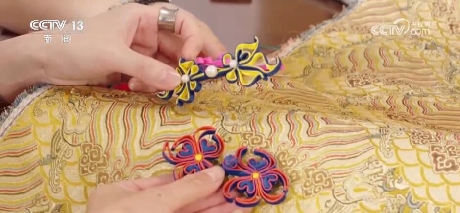 瑞蚨祥中式服裝手工制作技藝傳承人 汪超:這個就是機器(制作)的,你會看到它比較硬,比較板式一點。您看咱們手工的感覺就很軟,而且每一朵花像有生命力一樣。最不一樣看背面,它要不停地換線,不停地去計算,它哪該換線,哪該換色去織造,所以這也是機器織造物沒有辦法替代的很關鍵的點。
