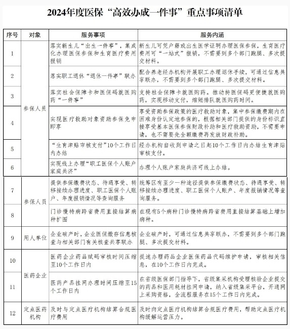 為貫徹落實(shí)《國務(wù)院關(guān)于進(jìn)一步優(yōu)化政務(wù)服務(wù)提升行政效能推動(dòng)“高效辦成一件事”的指導(dǎo)意見》(國發(fā)〔2024〕3號(hào),下文簡稱《指導(dǎo)意見》),精細(xì)化科學(xué)化常態(tài)化優(yōu)化醫(yī)保服務(wù),提高群眾、企業(yè)和醫(yī)藥機(jī)構(gòu)獲得感,國家醫(yī)療保障局今天(2月9日)發(fā)布關(guān)于在醫(yī)療保障服務(wù)領(lǐng)域推動(dòng)“高效辦成一件事”的通知,著力提供更加便捷高效的醫(yī)療保障服務(wù)。