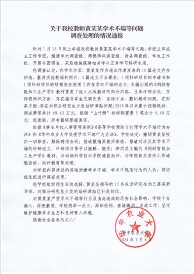 ·華中農(nóng)業(yè)大學(xué)通報(bào)教師黃某某學(xué)術(shù)不端等問題:撤職、解聘,其指導(dǎo)的15名研究生均已落實(shí)新導(dǎo)師。