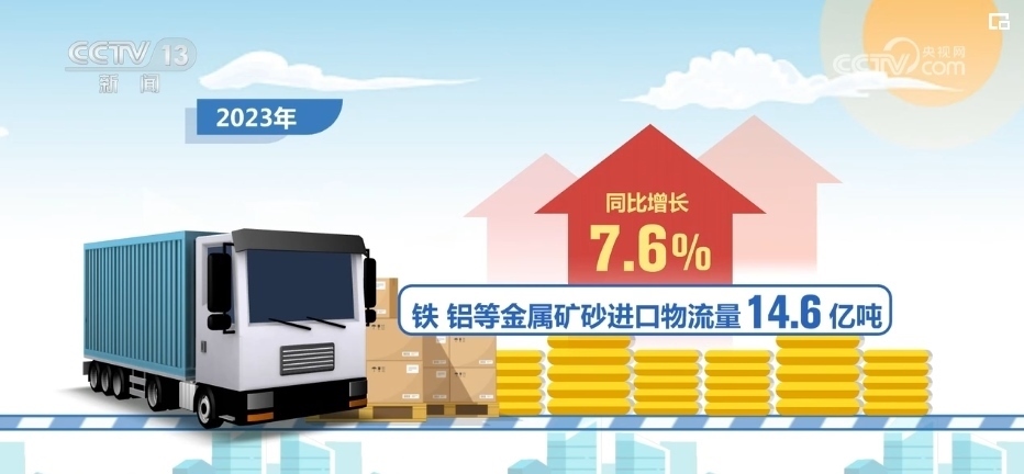 2023年,進(jìn)口物流總額18.0萬(wàn)億元,同比增長(zhǎng)13.0%,進(jìn)口物流量保持快速恢復(fù)態(tài)勢(shì)。原油、天然氣、煤炭等能源產(chǎn)品進(jìn)口物流量11.6億噸,同比增長(zhǎng)27.2%,鐵、鋁等金屬礦砂進(jìn)口物流量14.6億噸,同比增長(zhǎng)7.6%。