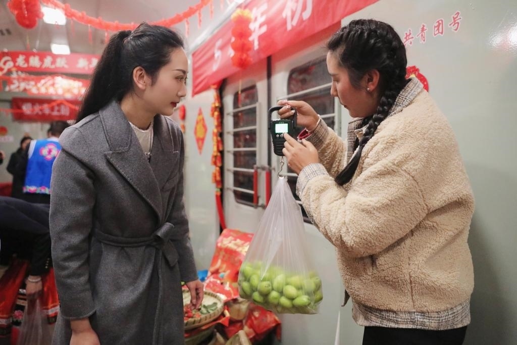 乘坐7466次列車的旅客在“慢火車”上的年貨街買水果。(中國(guó)鐵路昆明局集團(tuán)有限公司供圖)