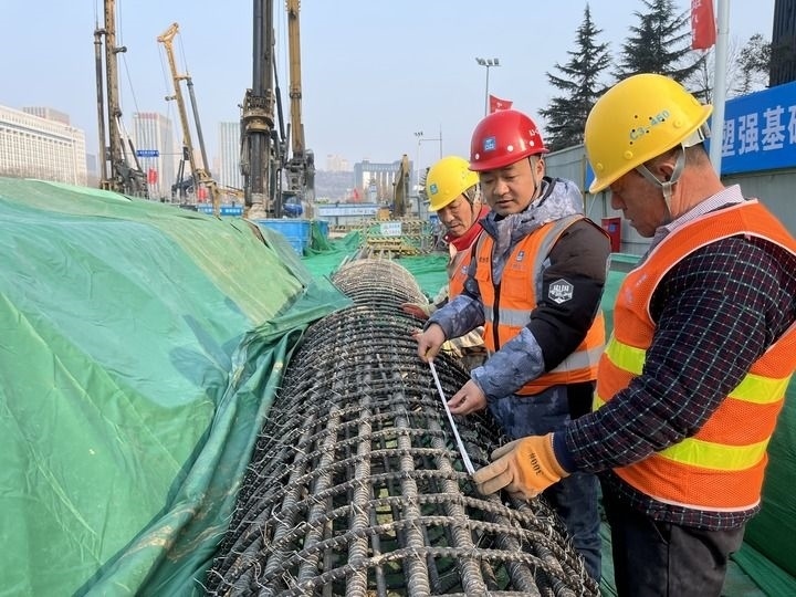 2024年2月9日,在中建八局承建的濟南軌道交通7號線一期工程的龍奧大廈站施工現(xiàn)場,質(zhì)量工程師劉學(中)在檢查鋼筋籠焊接質(zhì)量。新華社發(fā)