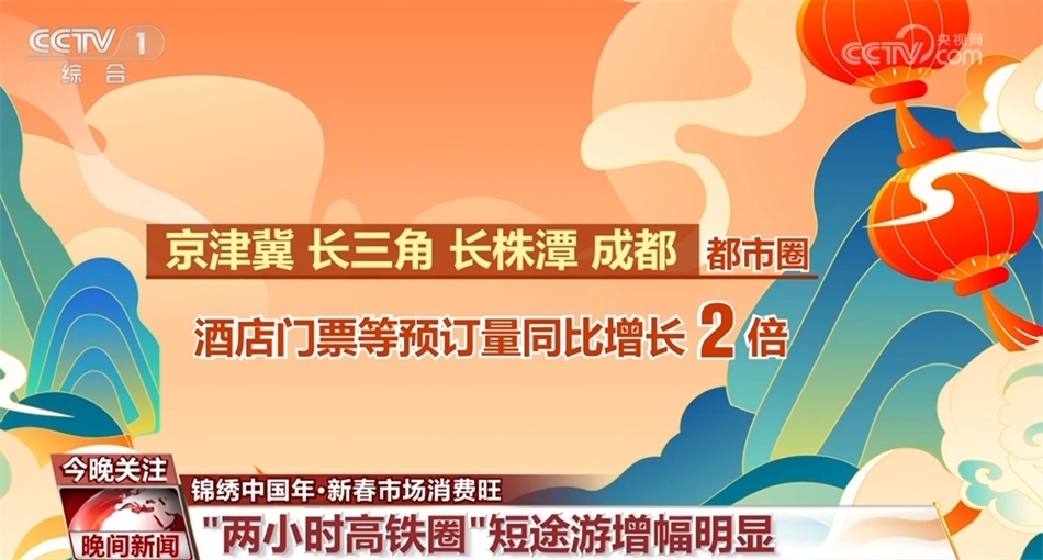 而在說走就走的短途游中,“兩小時高鐵圈”受到青睞。截至大年初一,春節(jié)假期“兩小時高鐵圈”短途游的搜索量同比增長7倍。從實際預訂情況看,京津冀、長三角、長株潭、成都都市圈等區(qū)域的酒店、門票等相關旅游產(chǎn)品預訂量同比增長2倍。