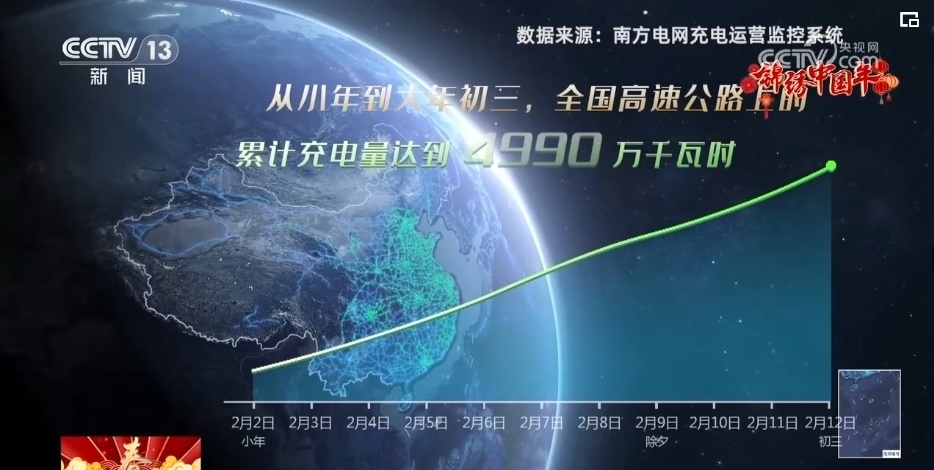 這個(gè)春節(jié),人們駕駛著新能源汽車,繪制出了一幅“綠色”的春節(jié)旅行軌跡圖。2.1萬個(gè)充電樁遍布各地的高速公路,從小年到大年初三,全國高速公路上的累計(jì)充電量達(dá)到4990萬千瓦時(shí)。