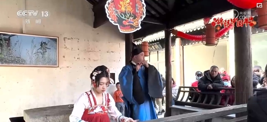 春節(jié)期間,伴隨著陣陣《茉莉花》的悠揚樂聲,在江南水鄉(xiāng)黎里古鎮(zhèn)的迎恩坊,游客市民欣賞演奏團隊奏響的新年歡樂樂章。石板道兩旁都換上了喜慶的紅色裝飾,糖畫攤、丟圈兒游戲的攤位前擠滿了躍躍欲試的人群。這幾天,黎里古鎮(zhèn)已經(jīng)迎來超過5萬名游客,較2023年同期翻了兩番。