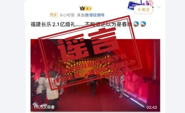 ·福建省互聯(lián)網(wǎng)辟謠平臺:“董事長之子婚宴斥資2.1億”嚴(yán)重失實,相關(guān)賬號禁言30日。