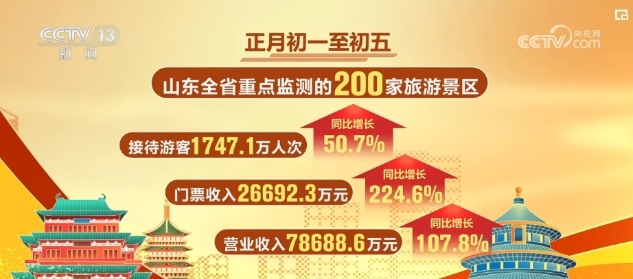 正月初一至初五,山東全省重點(diǎn)監(jiān)測(cè)的200家旅游景區(qū),累計(jì)接待游客超過(guò)1747萬(wàn)人次,門(mén)票收入超2.6億元,營(yíng)業(yè)收入超7.8億元,與上年同期相比,分別增長(zhǎng)50.7%、224.6%、107.8%。
