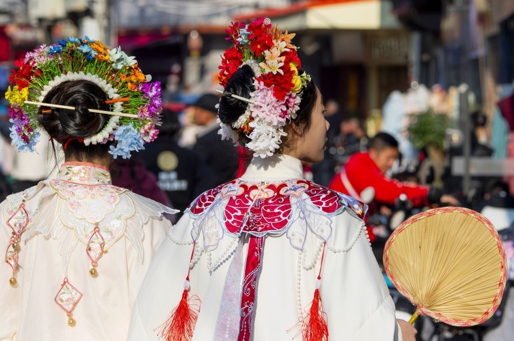 2024年1月26日,頭戴簪花的游客在福建省泉州市蟳埔村游覽。新華社記者 魏培全 攝