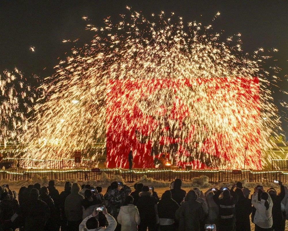 2024年2月10日,游客在河北省遵化市團(tuán)瓢莊鎮(zhèn)山里各莊景區(qū)觀看打鐵花表演。新華社發(fā)(劉滿倉 攝)