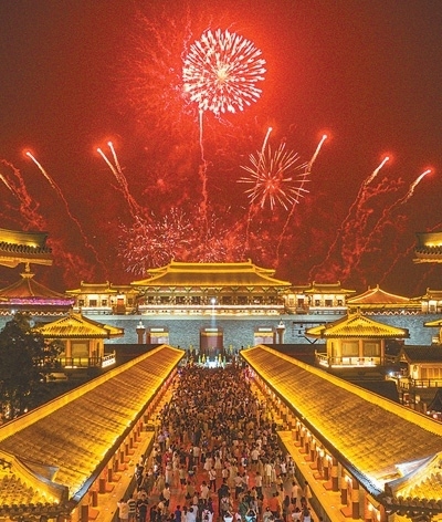 游客們在湖北省襄陽市唐城景區(qū)看煙花秀。當(dāng)?shù)嘏e辦的戲曲文化藝術(shù)節(jié)吸引了眾多省內(nèi)外游客前來,拉動當(dāng)?shù)芈糜谓?jīng)濟(jì)。據(jù)統(tǒng)計(jì),2023年國內(nèi)出游人次達(dá)48.91億,國內(nèi)游客出游總花費(fèi)4.91萬億元。楊 東攝(影像中國)