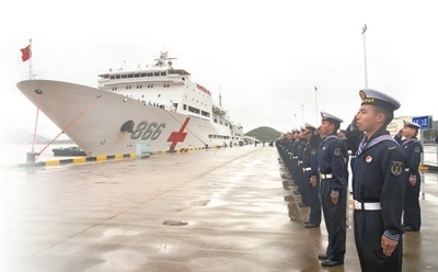執(zhí)行“和諧使命—2022”任務(wù)的中國海軍“和平方舟”號醫(yī)院船返回浙江舟山某軍港,任務(wù)部隊(duì)官兵代表在碼頭迎接。“和平方舟”號醫(yī)院船是我國自主設(shè)計(jì)建造的首艘制式遠(yuǎn)洋醫(yī)院船。自2008年入列以來,該船以“和諧使命”任務(wù)為主要載體,多次遠(yuǎn)赴海外開展人道主義醫(yī)療服務(wù)。孫 飛攝(新華社發(fā))