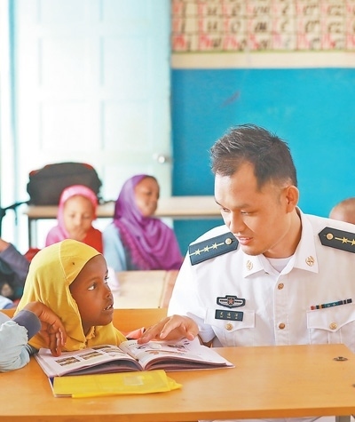 中國人民解放軍駐吉布提保障基地官兵與吉小學(xué)生交流。中國軍隊(duì)在吉布提建設(shè)保障基地,是中吉兩國政府經(jīng)過友好協(xié)商作出的決定,為中國軍隊(duì)執(zhí)行護(hù)航、維和任務(wù)等提供有力保障。30多年來,我國已派出維和人員5萬余人次,赴20多個(gè)國家和地區(qū)參加聯(lián)合國維和行動。王宗洋攝(影像中國)
