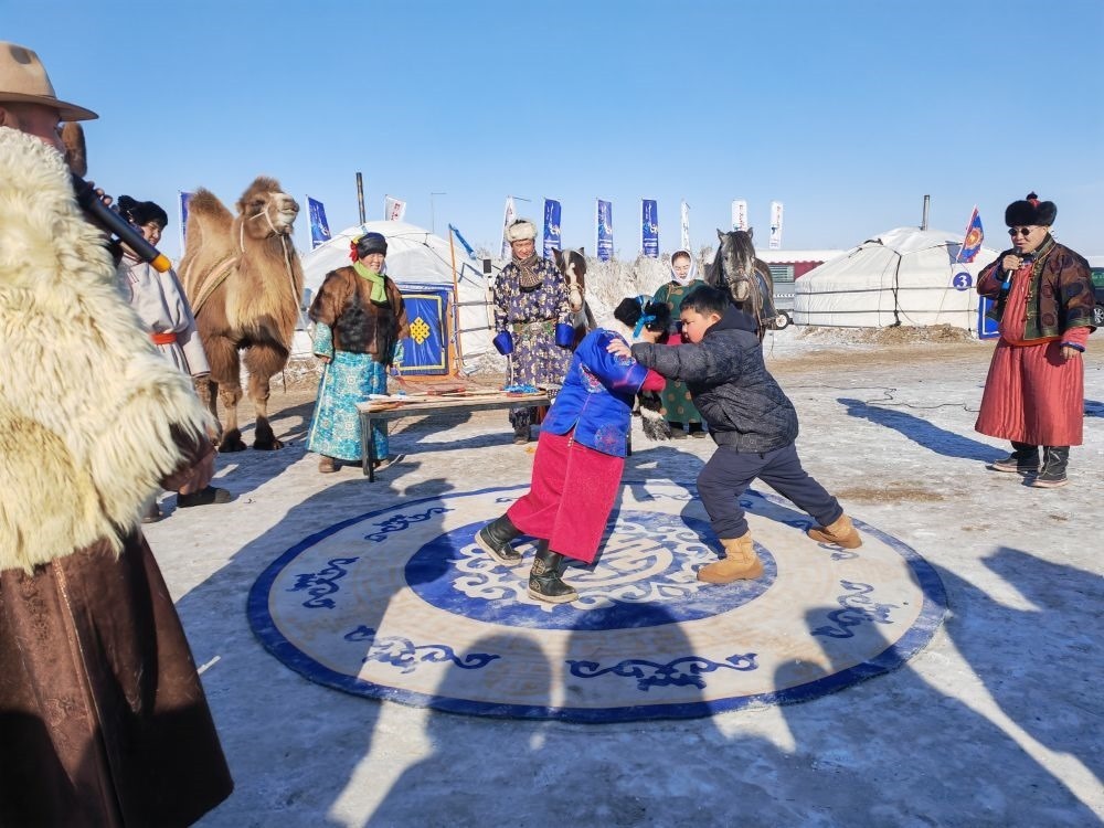 為迎接“十四冬”,呼倫貝爾推出了豐富多彩的文化活動和產(chǎn)品。陳巴爾虎旗的牧民巴圖蘇和與合伙人在莫爾格勒河景區(qū)推出“天天冰雪那達慕”活動,設雪地搏克、騎馬射箭、“冰地嘎拉哈”、駱駝爬犁等項目,讓游客沉浸式體驗蒙古族文化與傳統(tǒng)運動。首次嘗試雪地搏克的河北固安游客張瑞堂,與一位蒙古族少年友好競技,他的姐姐則用手機記錄下了這段珍貴的經(jīng)歷。