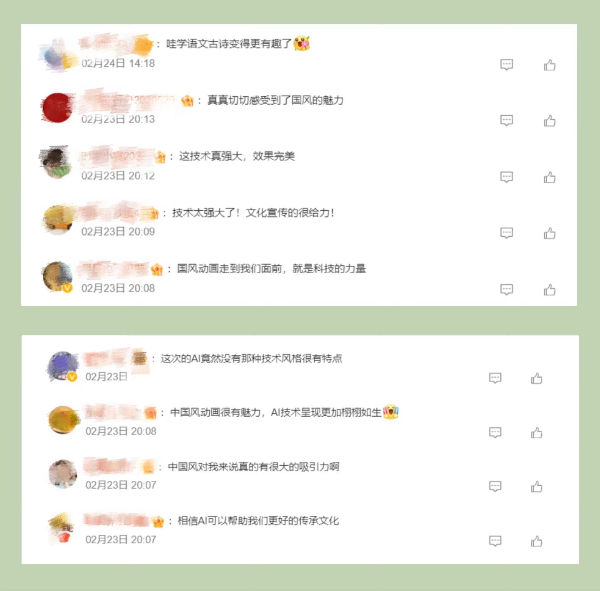 節(jié)目探索詩(shī)畫(huà)融通的國(guó)風(fēng)動(dòng)畫(huà)片新呈現(xiàn),讓廣大青少年進(jìn)一步加深了對(duì)中國(guó)經(jīng)典詩(shī)詞的理解和喜愛(ài)。“AI”“總臺(tái)”“千秋詩(shī)頌”等成為網(wǎng)友熱議高頻詞。截至2月27日20:00,話題#千秋詩(shī)頌#閱讀量超791萬(wàn)次。網(wǎng)友紛紛留言:“看到這個(gè)系列片,我真的深深感受到了中國(guó)傳統(tǒng)文化的深厚底蘊(yùn)。這些古詩(shī)詞深入骨髓,流淌在我們的血液中,是我們國(guó)家的文化符號(hào)”“以AI為媒,央視制作的這部國(guó)風(fēng)動(dòng)畫(huà)片傳承了經(jīng)典,喚醒了古韻的新生命”“唯美的畫(huà)面讓人動(dòng)容,用視覺(jué)的形式了解《別董大》這一首古老的詩(shī)歌更別有一番韻味”“這種科技與動(dòng)畫(huà)片的結(jié)合,恰好是現(xiàn)在小朋友們和大朋友們所需要的”。