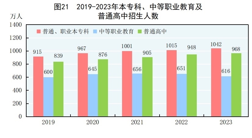 全年研究生教育招生130.2萬人,在學研究生388.3萬人,畢業(yè)生101.5萬人。普通、職業(yè)本???sup>[70]招生1042.2萬人,在校生3775.0萬人,畢業(yè)生1047.0萬人。中等職業(yè)教育[71]招生616.5萬人,在校生1737.9萬人,畢業(yè)生537.1萬人。普通高中招生967.8萬人,在校生2803.6萬人,畢業(yè)生860.4萬人。初中招生1754.6萬人,在校生5243.7萬人,畢業(yè)生1623.6萬人。普通小學招生1877.9萬人,在校生10836.0萬人,畢業(yè)生1763.5萬人。特殊教育招生15.5萬人,在校生91.2萬人,畢業(yè)生17.3萬人。學前教育在園幼兒4093.0萬人。九年義務教育鞏固率為95.7%,高中階段毛入學率為91.8%。