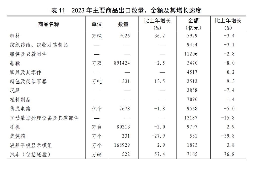 全年貨物進出口總額417568億元,比上年增長0.2%。其中,出口237726億元,增長0.6%;進口179842億元,下降0.3%。貨物進出口順差57883億元,比上年增加1938億元。對共建“一帶一路”[46]國家進出口額194719億元,比上年增長2.8%。其中,出口107314億元,增長6.9%;進口87405億元,下降1.9%。對《區(qū)域全面經(jīng)濟伙伴關(guān)系協(xié)定》(RCEP)其他成員國[47]進出口額125967億元,比上年下降1.6%。民營企業(yè)進出口額223601億元,比上年增長6.3%,占進出口總額比重為53.5%。