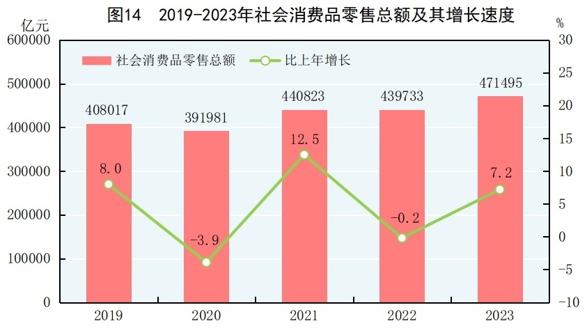 全年社會消費品零售總額471495億元,比上年增長7.2%。按經(jīng)營地分,城鎮(zhèn)消費品零售額407490億元,增長7.1%;鄉(xiāng)村消費品零售額64005億元,增長8.0%。按消費類型分,商品零售額418605億元,增長5.8%;餐飲收入52890億元,增長20.4%。服務零售額[36]比上年增長20.0%。